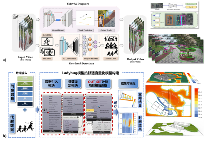 1)多源数据动态采集:在目标场地布设小型水热监测站,实时获取温度、湿度、风速等气象因子。同步利用文化服务AI智慧监测系统,集成YOLOv5行人检测与DeepSort多目标跟踪算法实现行人连续追踪,并采用SlowFast双流卷积神经网络自动识别行走、站立、锻炼等活动类型;